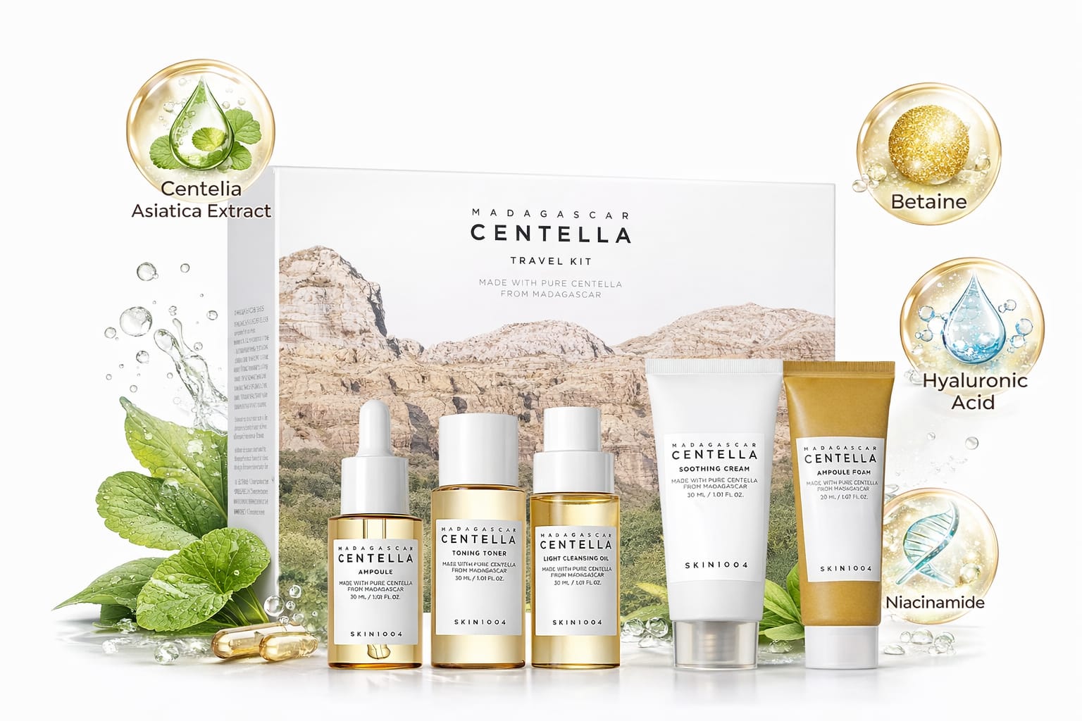 دلّلي بشرتك في كل مكان مع طقم العناية المصغر سينتيلا من SKIN1004 – عناية يومية متكاملة بتركيبة طبيعية بحجم مناسب للحقيبة!